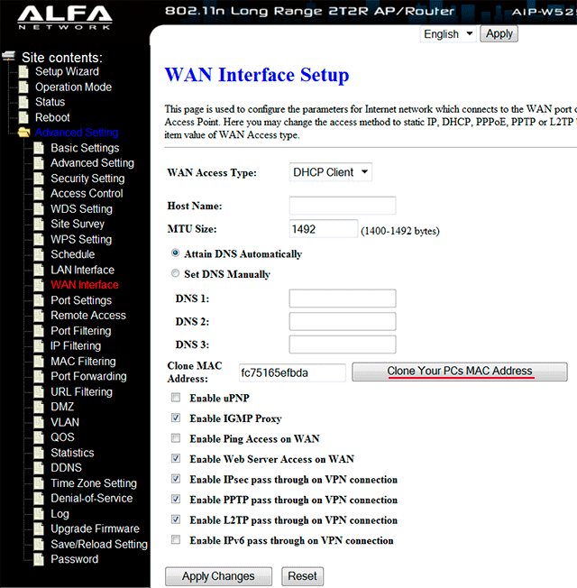 Откройте в настройках роутера меню Advanced Setting - WAN Interface и нажмите кнопку Clone Your PCs MAC Address. После этого в поле Clone MAC Address появится MAC адрес компьютера. Далее нажмите кнопку Apply Changes.