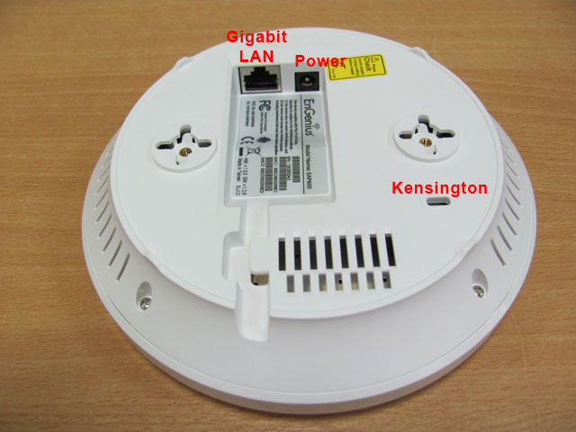 Снизу устройства находится гигабитный сетевой порт, разъем для подключения блока питания, отверстия для крепления устройства на стену и вентиляционные отверстия. Также на корпусе есть небольшое овальное отверстие для установки специального замка Kensington со стальным тросиком. Такие замки можно встретить в супермаркетах, которые продают ноутбуки и другую технику. Этот замок позволяет снизить риск кражи устройства.