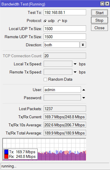 Двунаправленный тест по протоколу UDP пакетами размером 1500 байт показал среднюю скорость Tx 190 / Rx 181 Мбит/с.