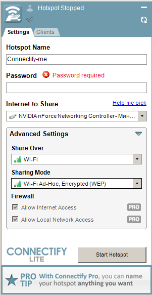 Настройку Wi-Fi адаптера в режиме Wi-Fi точки доступа можно настроить штатными средствами операционной системы, но в большинстве случаев для обычного пользователя это довольно сложный процесс. Поэтому мы предлагаем выполнить настройку более простым путем - с помощью бесплатной программы Connectify.