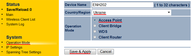 Откройте меню Operation Mode, укажите режим работы Access Point и в поле Counrty/Region выберите вашу страну. Для сохранения и применения настроек нажмите кнопку Save & Apply.