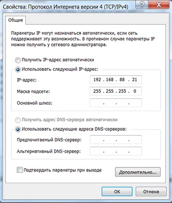 Выберите Использовать следующий IP-адрес, введите IP-адрес 192.168.88.21, Маску подсети 255.255.255.0 и нажмите кнопку OK.