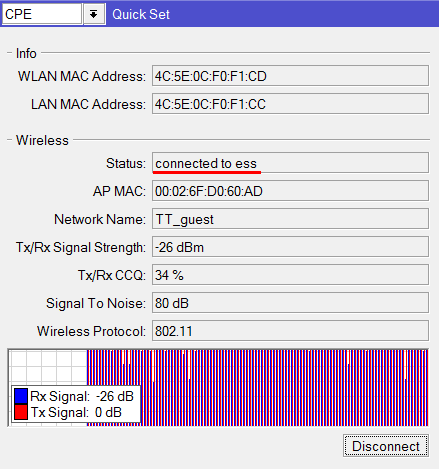 После этого устройство должно подключиться к базовой станции в режиме клиента. Чтобы проверить это, откройте меню Quick Set. У вас должен появиться Status: connected to ess и параметры подключения.