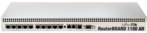 Высокопроизводительный роутер с тринадцатью гигабитными портами. Пропускная способность RB1100AH более 3 Гбит/с при полумиллионе пакетов в секунду. Поставляется в алюминиевом корпусе (1U rackmount) и блоком питания. Лицензия RouterOS level 6.